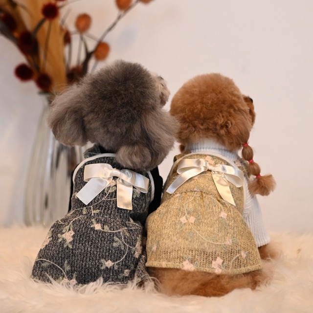 【商品説明】 伸縮性のあるベロアニットを使用しています。 上品な小花柄がかわいいアイテムです。 スカート部分がジョーゼット生地なので重すぎない印象になります◎ 歩くたびにひらひら揺れるスカートもとてもかわいいです。 素材:トップス部分ポリエステル95%、ポリエチレン5% スカート部分ポリエステル100% 【モデル着用サイズ】 ティーカッププードル(シルバー) 着用サイズ XS 胸周り 28 着丈 20 首周り 17 体重 1.6kg ティーカッププードル(レッド) 着用サイズ XS 胸周り 32 着丈 20 首周り 19 体重 1.9kg ※商品によって多少の誤差が生じます。予めご了承ください。 *生地の作りが甘い、生地が薄い、多少のキズ、汚れがある、糸くずが見える、畳シワや折シワなどがある場合がございます。 *パソコンやディスプレイの環境、設定、見る角度によっては、本物と若干異なって見える場合がございますので、ご理解ご了承くださいませ。 *返品、交換は承っておりません。