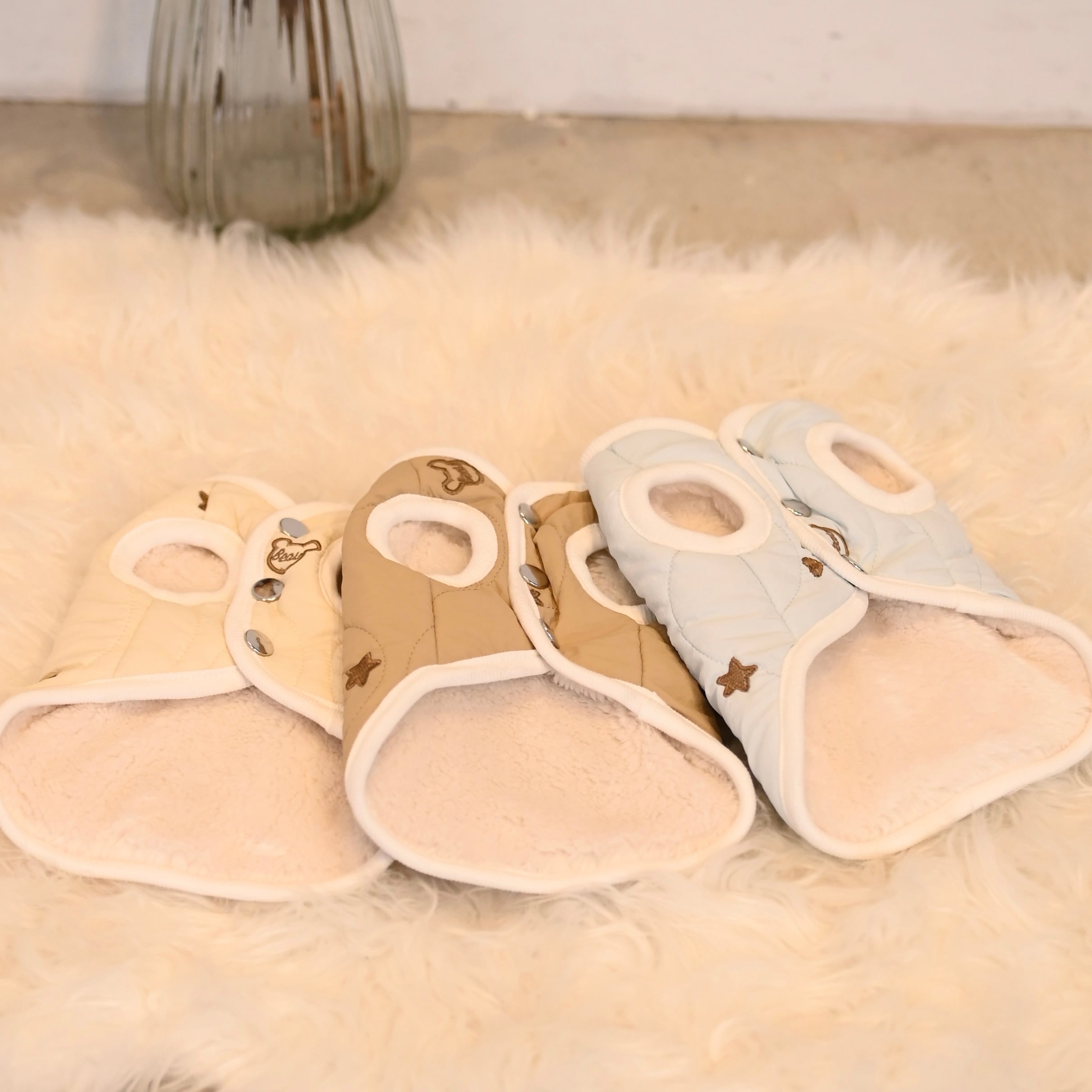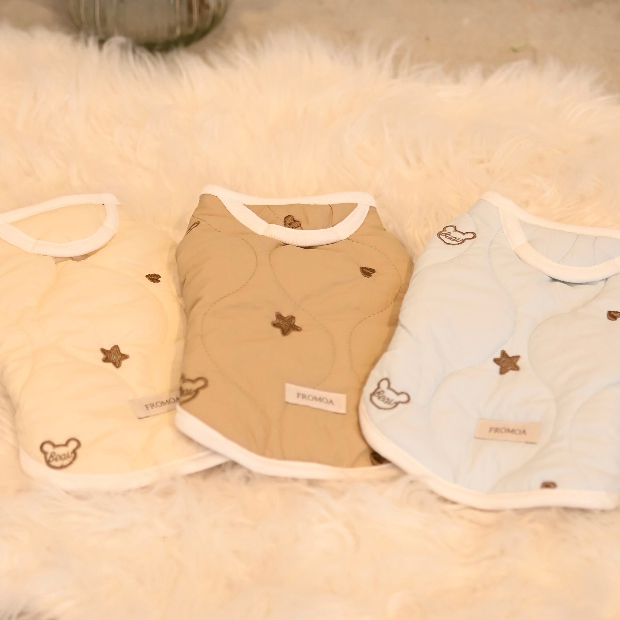優しい色合いの生地にくまさんや星、ハートの刺繍が散りばめられた可愛らしいダウンベストです。