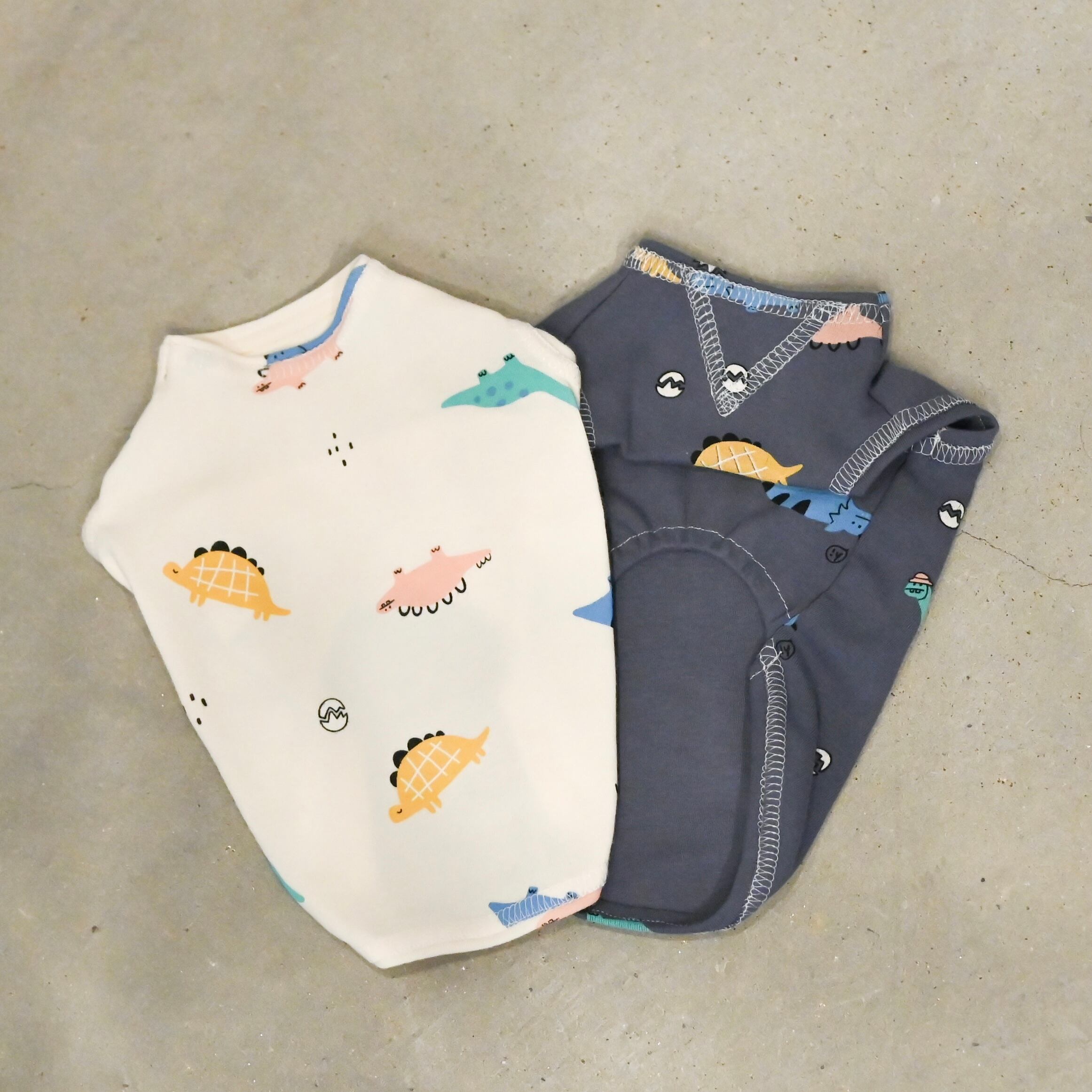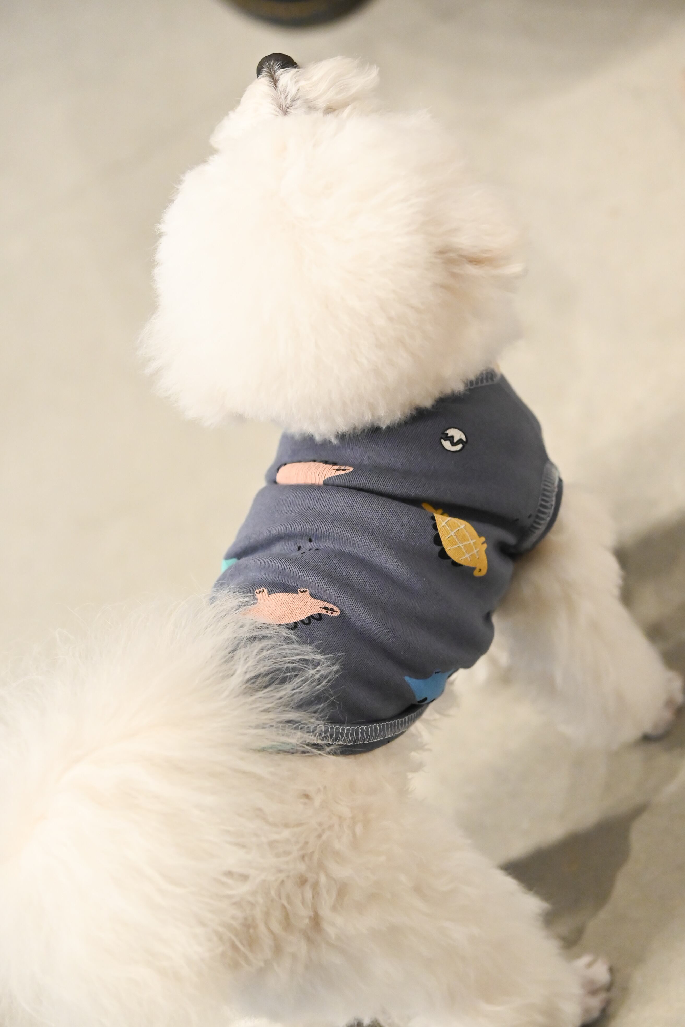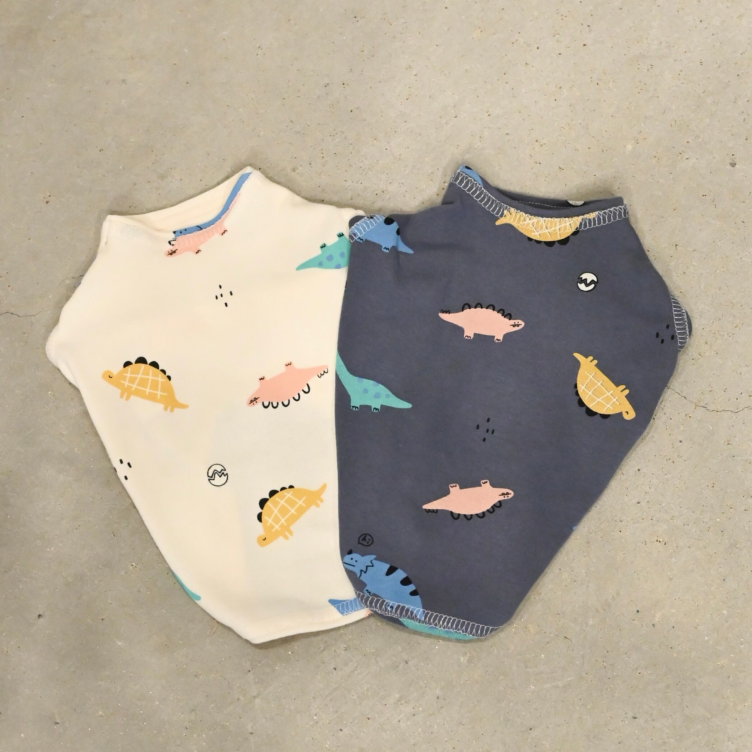ステッチがポイントの恐竜がいっぱいのTシャツです。